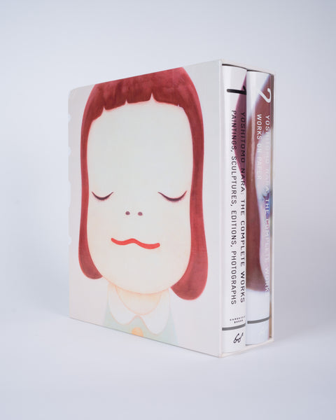 Bumping to one top corner of slipcase, plus some additional overall minor shelf wear to slipcase. Some minor shelf wear to dust jackets of books themselves. Overall, books are in near-fine condition and appear unread. The catalog raisonee of Yoshitomo Nara, one of the world's most popular living artists. Stated first edition. Very rare. Became especially valuable after Yoshitomo Nara, who was personally involved in compiling this overview, noticed after publication that Drawings #203 and #204 were in fact forgeries and encouraged his Twitter followers to purchase these erroneous first editions. Includes limited edition tote bag.